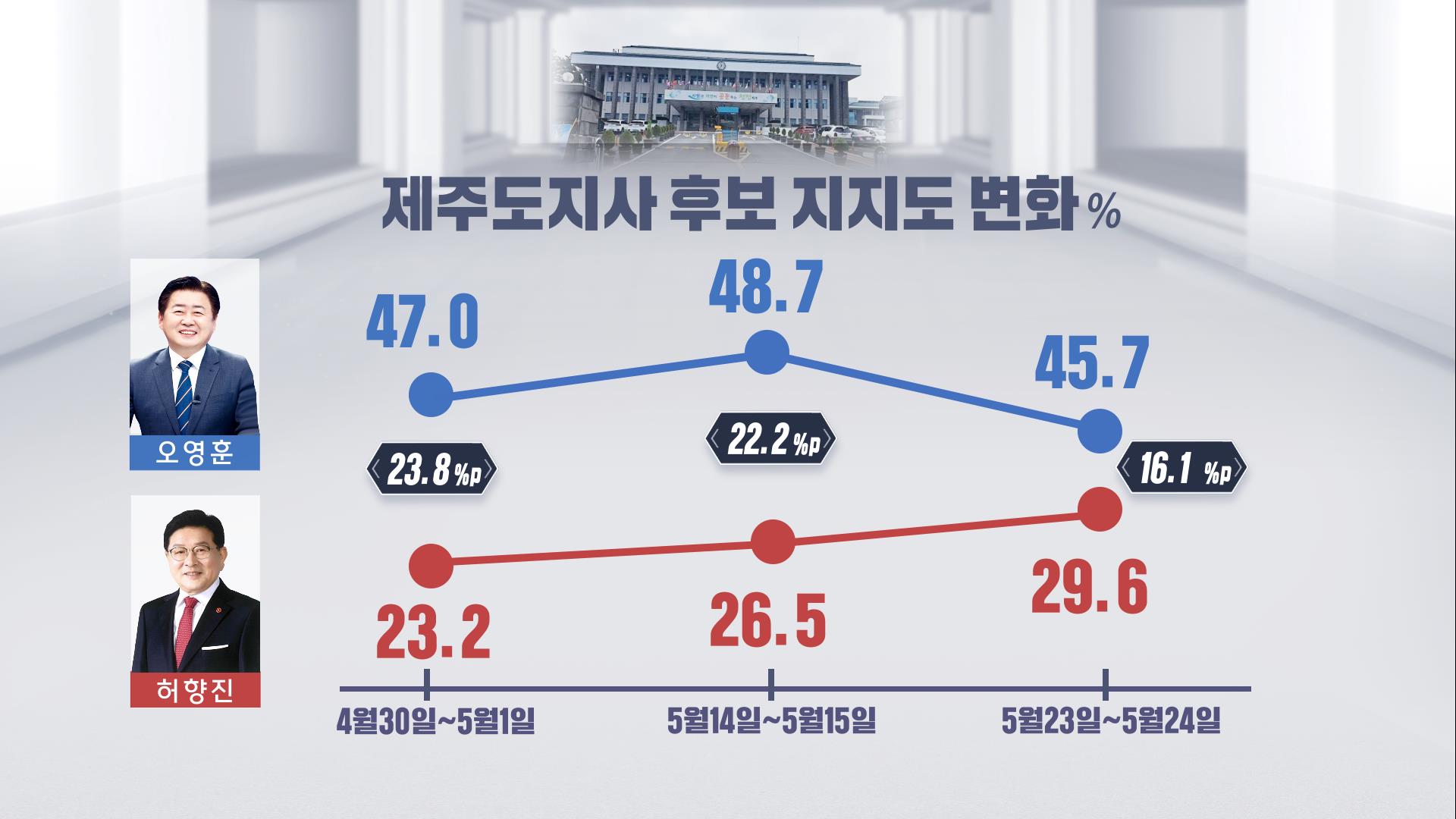 민주당 오영훈 후보 45.7%, 국민의힘 허향진 후보 29.6%로 오영훈 후보가 16.1%p 앞섰다.