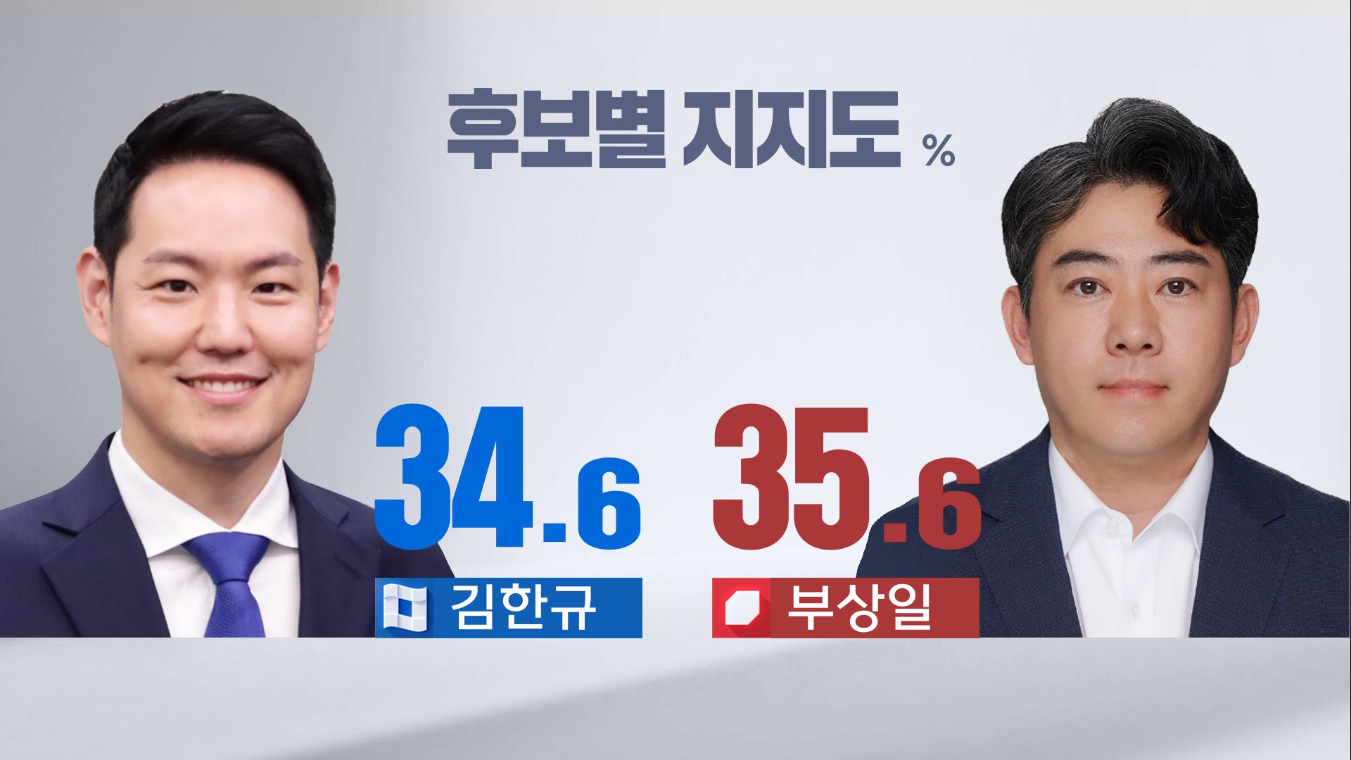 민주당 김한규 후보가 34.6%, 국민의힘 부상일 후보가 35.6%로 오차 범위내에서 단 1%p 차이를 보였다.