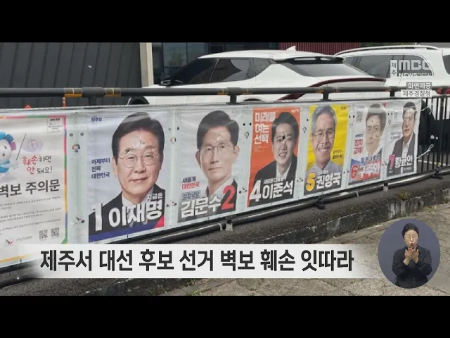 뉴스데스크 뉴스데스크뉴스투데이기획뉴스유튜브 뉴스페이스북 뉴스 prev 2025.5.21 - 수요일 next 권영국 대선 후보 "노동자·서민의 삶 바꾸겠다" ◀ 앵 커 ▶ 대선을 앞두고 민주노동당 권영국 후보가 제주를 찾아 유권자들을 만났습니다. 이번 선거에서 유일한 진보정당 후보인 만큼 사회 대개혁과 노동, 환경, 돌봄 중심의 정책을 밝혔습니다. 김항섭... 김항섭 "재판절차 어겼다" 시민단체가 판사 고발 ◀ 앵 커 ▶ 최근 제주지방법원에서 국가보안법 피의자의 호송을 방해했다며 시민단체 회원들이 법정구속되는 일이 있었는데요. 당시 재판절차가 위법이었다며 시민단체가 판사를 공수처에 고발... 조인호 권영국 후보 "제주 제2공항은 백지화" ◀ 앵 커 ▶ 권영국 민주노동당 대선 후보는 제주 제2공항 건설 사업은 명분 없는 공사라며 백지화를 제주 지역 첫 번째 공약으로 제시했는데요. 제주MBC는 제주를 찾은 권영국 후보를 초청해 지역 정책에... 홍수현 내일 이재명 민주당 대선 후보 제주 유세 이재명 더불어민주당 대선 후보가 내일(22일) 제주를 찾아 표심 잡기에 나섭니다. 이재명 후보는 내일(22일) 오전에 제주시 일도동 동문로터리에서 집중 거리 유세를 펼칠 예정입니다. 한편, 국민의힘 ... 박주연 제주서 대선 후보 선거 벽보 훼손 잇따라 제주에서 대통령 선거 벽보를 훼손한 사건이 잇따라 경찰이 수사에 나섰습니다. 경찰에 따르면 어제(20일) 오전 8시 50분쯤 서귀포시 동홍동에서 모든 대선 후보 벽보의 얼굴 사진 부분에 구멍이 뚫려 ... 장우리 민주당 제주선대위, '정당 사칭 사기' 경찰에 고발 대통령 선거를 앞두고 정당 관계자를 사칭한 예약 부도 사기가 잇따라 발생하자 더불어민주당 제주도당 선거대책위원회가 법적 대응에 나섰습니다. 더불어민주당 제주선대위는 최근 민주당 관계자를 사칭... 장우리 분산에너지특화지역 최종 후보에 제주 선정 정부가 추진하는 분산에너지 특화지역 최종 후보지로 제주가 선정됐습니다. 산업통상자원부는 분산에너지특화지역 실무위원회를 열고 전국 11개 광역자치단체 가운데 제주를 포함한 7곳을 최종 후보지로... 송원일 고도완화 방안 의견수렴 6월 말까지 연장 제주도가 추진하는 고도 완화 방안과 관련해 의견수렴 기간이 연장됩니다. 제주도는 당초 지난 19ㅇ리까지로 하기로 했던 제주형 압축도시 조성을 위한 고도관리 방안에 대한 의견수렴을 폭넓은 의견수... 송원일 20년째 지지부진 롯데리조트 사업기간 5년 연장 신청 20년째 공사가 지지부진한 제주롯데리조트 개발사업 기간을 5년 더 연장해달라는 신청이 접수돼 논란이 예상됩니다. 사업자인 호텔롯데는 서귀포시 색달동 41만여 제곱미터 부지에 3천790억 원을 들여 ... 송원일 위조 신분증으로 제주 빠져나가려던 외국인 5명 구속 제주에 무비자 입국한 뒤 위조된 외국인등록증으로 다른 지방으로 빠져나가려던 외국인들이 붙잡혔습니다. 법무부 제주출입국·외국인청은 제주에 무사증으로 들어온 뒤 지난달 제주항에서 여객선에 탑승... 장우리 전교조 "대선캠프에서 교사에게 동의없이 임명장" 전교조 제주지부는 일부 대선 캠프에서 현직 교사의 동의 없이 일방적으로 교육 자문 명목의 임명장을 수여하는 사례가 확인됐다고 밝혔습니다. 전교조는 교사들에게 헌법상 정치기본권이 보장되지 않는... 조인호 26일부터 성산읍에 공공심야약국 운영 제주 동부지역의 의료공백 대책으로 26일부터 서귀포시 성산읍에 공공심야약국이 운영됩니다. 제주도는 의료 취약지역 주민들의 심야시간 의약품 구입 불편을 해소하고 경증환자의 응급실 이용을 줄이기... 송원일