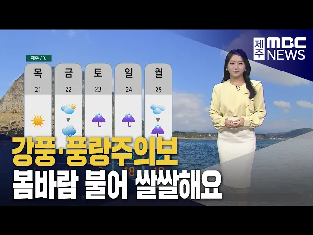 뉴스투데이 뉴스데스크뉴스투데이기획뉴스유튜브 뉴스페이스북 뉴스 prev 2024.3.20 - 수요일 next 4.3전야제 등 4.3기념 행사 전국에서 개최 제76주년 제주4.3희생자 추념기간을 맞아제주를 비롯해 전국 곳곳에서추념 행사가 열립니다.추념식 전날 저녁에는 제주아트센터에서4.3의 아픔을 뮤지컬과 춤, 노래 등 예술로 표현하는 무대가 펼처집니다... 이소현 4·3희생자 추념일에 묵념 사이렌 울린다 제76주년 4.3희생자 추념식에 맞춰 제주도 전역에 추모 사이렌이 울립니다. 제주도는 추념식 당일 오전 10시부터 도내에 설치된 민방위경보시설 63곳을 통해 희생자를 추모하기 위한 묵념 사이렌을 1분 동... 박주연 절기'춘분'..봄바람 강해 강풍주의보 이제 밤보다 낮의 길이가 길어지기 시작하는 춘분입니다절기상으로 봄의 시작인데요오늘 하늘은 맑고 쾌청한데 바람이 매우 강하게 불겠습니다남부지역을 제외한 제주도 전 지역에강풍주의보가 발효 중입... 정희원