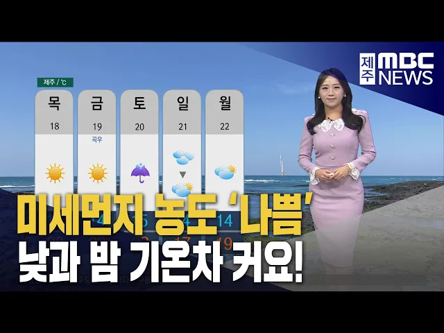 뉴스투데이 뉴스데스크뉴스투데이기획뉴스유튜브 뉴스페이스북 뉴스 prev 2024.4.17 - 수요일 next 추자도 항로 신규여객사 응모 제주-추자도 항로의 신규 여객선취항이 추진됩니다. 부산지방해양수산청 제주해양수산관리단에따르면 제주와 하추자, 완도를 잇는 정기 여객운송사업자 3차 공모에2개 사업자가 신청한 것으로 나타났습니... 권혁태 중국 노동절 연휴, '유커' 몰릴듯 다음달 1일부터 시작되는중국 노동절 연휴를 맞아 많은중국인 관광객의 제주방문이 회복될지주목됩니다. 다음달 1일부터 닷새간 이어지는 중국노동절 연휴 기간 제주와 중국 대도시 직항노선은 주 126회 ... 권혁태 [강원영동]230만 년 자연의 비밀 '바다부채길' 연장 ◀ 앵 커 ▶바다를 바라보며해안단구의 절경도 즐길 수 있는강릉 정동·심곡 바다부채길이 정동항까지 연장됐습니다.그동안 가파른 계단 때문에 힘들었던 구간 대신계단이 없이 편안하게 걸을 수 있는구간으... 한낮 포근..오늘도 황사 영향 공기질 탁해 황사의 영향으로 오늘도 공기가 탁하겠습니다어제부터 북서풍을 타고 황사가 유입되면서제주의 미세먼지 농도도 '나쁨' 수준을보이고 있는데요현재 제주시 연동은 1세제곱미터당155마이크로그램으로 먼지 ... 정희원