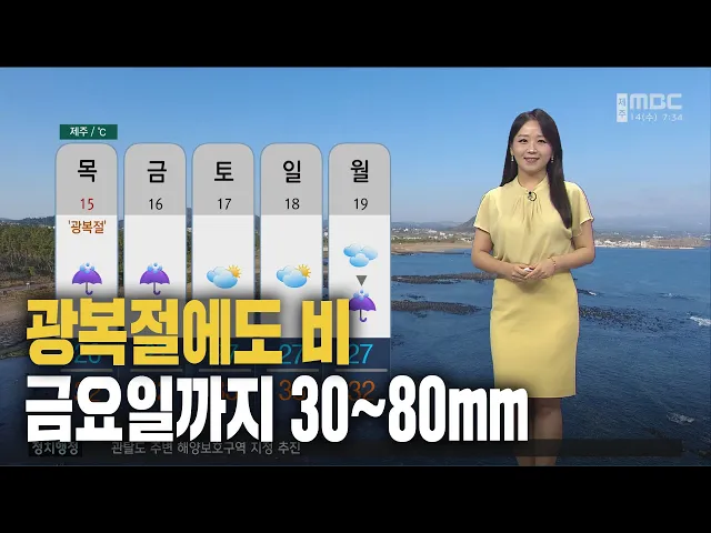 뉴스투데이 뉴스데스크뉴스투데이기획뉴스유튜브 뉴스페이스북 뉴스 prev 2024.8.14 - 수요일 next 제주생명평화대행진 8월 22~24일 열려 올해 제주생명평화대행진이 오는 22일부터 사흘 동안 진행됩니다.제주생명평화대행진 조직기획위원회는제주도의회에서 기자회견을 갖고오는 22일부터 24일까지 서귀포시 강정마을에서 제2공항 예정지인 성... 조인호 학교 주변 금연구역 10m에서 30m로 확대 교육 시설 주변의 금연 구역이10미터에서 30미터로 확대됩니다.제주도는오는 17일부터 어린이집과 유치원, 학교 주변 금연 구역을기존 10미터에서 30미터로 확대해도내 716곳의 시설에 적용한다고 밝혔습... 이소현 아동급식카드 하루 사용액 이달부터 인상 아동급식카드 하루 사용액이이달부터 인상됐습니다.제주도는학교를 가지 않고 여름방학을 보내는 아동들을 위해 이달 말까지 아동급식 카드의 하루 사용 한도액을기존 2만 원에서 3만 원으로 상향 조정했... 박주연 말복더위 식혀주는 반가운 '비' 내려요! 오늘 삼복더위의 마지막인 말복입니다. 기압골의 영향으로 뜨거운 열기를 식혀줄 반가운 비가 내리겠습니다. 현재 제주 북부지역은 비구름이 발달하면서 비가 오는 곳이 있는데요 점차 제주 전 지역으로... 정희원