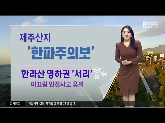 뉴스투데이 뉴스데스크뉴스투데이기획뉴스유튜브 뉴스페이스북 뉴스 prev 2024.11.18 - 월요일 next 영어교육도시 인근 성장관리계획구역 지정 서귀포시 영어교육도시 인근이성장관리계획구역으로 지정됩니다. 서귀포시는 영어교육도시와 영어교육도시 제2진입로 확장지역 일원을 난개발 방지를 위해개발 행위를 할 경우 기반시설 도로 6미터 확보... 권혁태 [제주날씨]찬바람 불어 기온 '뚝'·한라산 '한파주의보' 오늘 옷차림 따뜻하게 하시기 바랍니다.북서쪽에서 찬 공기가 밀려오면서찬바람도 강하게 불 텐데요아침 기온이 어제보다 7~9도가량뚝 떨어졌습니다.현재 제주의 아침 기온 9.6도 보이고 있고 낮에는 11... 정희원