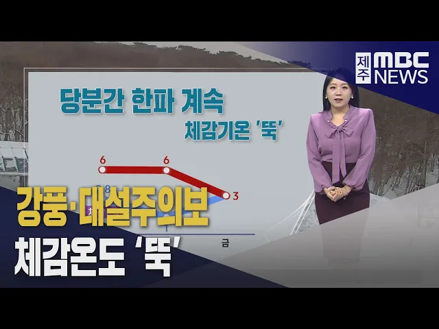 뉴스투데이 뉴스데스크뉴스투데이기획뉴스유튜브 뉴스페이스북 뉴스 prev 2025.2.5 - 수요일 next 당분간 한파·폭설 이어져‥제주 최대 20cm 많은 눈 전국적으로 한파가 기승을 부리고 있습니다.오늘도 따뜻하게 입고 나오셔야겠는데요제주도 대부분 지역에서 아침 체감온도가 영하권을 보이고 있습니다.내일은 아침 기온이 1도까지 내려가겠고당분간 한... 정희원 성산일출봉농협 조합장 보궐선거 박명종 후보 당선 성산일출봉농협 조합장 보궐선거에서 박명종 후보가 당선됐습니다. 박 후보는 전체 유효 투표수 2천570표 가운데 52.02%인 천337표를 얻어 김법수, 현승민 후보를 누르고 당선됐습니다. 박 조합장의 임... 이소현 취업 준비 청년 자격증·어학시험 응시료 지원 취업을 준비하는 청년들에게 시험 응시료가 지원됩니다. 제주시와 서귀포시는 오는 10일부터 취업을 준비하는 청년을 대상으로 자격증과 어학시험 응시료를 지원한다고 밝혔습니다. 지원 대상은 제주에... 이소현 "추자도 체류형 관광 산업 전환해야" 추자도를 체류형 관광 산업으로 전환해야 한다는 분석이 나왔습니다. 제주연구원은 추자도 관광 활성화를 위한 정책연구보고서에서 경험 가치를 높이는 체류형 관광으로의 체질 변화가 필요하다며 여객... 이소현 골프장 내장객 감소세‥도외·외국인 7.8%↓ 제주 지역 골프장 이용자가 계속해서 줄어들고 있습니다. 제주도에 따르면 지난해 도내 골프장 내장객은 234만 7천여 명으로 1년 전 같은 기간보다 2.8% 줄었습니다. 특히 주 고객층이던 다른 지역 골... 이소현 제주MBC, 4·3영화 <내 이름은> 홍보 업무협약 제주MBC와 4·3영화 내 이름은 제작위원회가 업무협약을 맺었습니다. 이번 업무협약을 통해 제주MBC와 제작위원회는 영화제작 후원 모금을 함께 시청자들에게 알리고 영화 관련 프로그램을 제작하기로 했... 이소현 제주시, 위기가구 신고자에게 포상금 지급 제주시는 경제적 어려움을 겪고 있는 위기가구를 발굴한 사람에게 포상금을 지급합니다. 신고 대상은 소득이 없거나 위기상황으로 도움이 필요한 비수급 가구인데 제주도민이면 누구나 신고할 수 있습니... 송원일