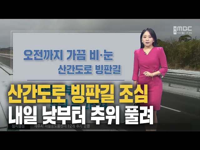 뉴스투데이 뉴스데스크뉴스투데이기획뉴스유튜브 뉴스페이스북 뉴스 prev 2025.2.10 - 월요일 next 지난달 제주 찾은 관광객 98만 명 4년 만에 최저치 지난달 제주지역 관광객이 4년 만에 최저치를 기록했습니다. 제주도관광협회에 따르면 지난달 제주를 찾은 관광객은 98만 천500여 명으로 코로나19 유행기인 지난 2천21년 이후 가장 적었습니다. 특히,... 박주연 오전까지 가끔 눈비·내일 낮부터 추위 누그러져 2월의 막바지 한파가 기승을 부리고 있습니다.월요일 아침 서부지역 고산은 체감온도가 영하권을 보이고 있는데요현재 산지에는 눈이 내리고 있어서1100도로 일부구간은 교통통제 중입니다.오전까지 비가... 정희원