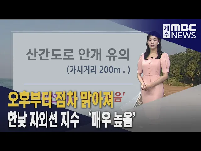 뉴스투데이 뉴스데스크뉴스투데이기획뉴스유튜브 뉴스페이스북 뉴스 prev 2025.6.3 - 화요일 next 선거일 아침 흐림…오후엔 햇살 선 당일인 오늘, 흐린 하늘과 함께 산발적인 이슬비가 내리겠습니다. 오전 투표소로 향하실 땐 우산 꼭 챙기시기 바랍니다.비가 내리는 지역에 가시거리가 짧아지는 곳이 있겠는데요. 특히, 산간도로에 20... 김희서 도내 수출기업 정책지원 간담회 개최 제주도가 미국 관세 확대에 따른 수출 기업들의 어려움을 해결하기 위한 현장 맞춤형 지원에 나섭니다. 제주도와 기획재정부는 내일(4일) 제주경제통상진흥원에서 수출기업 간담회를 공동으로 열고 제주... 박주연 미국 프리스턴대 학생들 '런케이션' 제주 방문 미국 프리스턴대 학생들이 학습과 휴가를 함께하는 런케이션을 위해 제주를 찾습니다. 제주도에 따르면 프린스턴대 학생 12명은 내일(3일) 제주를 찾아 닷새 동안 금오름과 협재해수욕장 방문 등 런케이션... 박주연 폭염 피해 여름철 농업재해대책 상황실 운영 기상 재해 대응을 위해 농업재해대책 상황실이 운영됩니다. 여름철 농업재해대책 상황실은 제주도 농업기술원과 권역별 4개 농업기술센터에 설치돼 운영되는데, 기상현황 분석과 정보 전파, 피해 발생 시 ... 박주연 제주역사 정립사업 지원 조례 입법예고 제주 역사 정립 사업이 본격적으로 추진됩니다. 제주도는 탐라국 고양부 삼성 시조부터 입도조까지 제주 역사를 정립하는 사업 내용을 담은 제주역사 정립 사업 지원에 관한 조례안을 입법예고하고, 다음 ... 홍수현