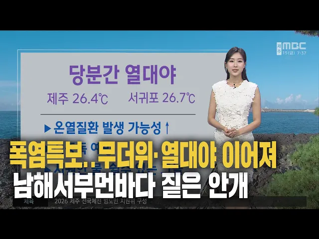 뉴스투데이 뉴스데스크뉴스투데이기획뉴스유튜브 뉴스페이스북 뉴스 prev 2025.8.15 - 금요일 next 제주중앙중·제주중앙여중 남녀공학 전환 제주중앙중학교와 제주중앙여자중학교가 2028년부터 남녀공학으로 전환됩니다. 제주도교육청은 두 학교가 학교운영위원회 심의를 거쳐 남녀공학 전환을 신청함에 따라 최종 확정했다고 밝혔습니다. 이... 조인호 제주 해수욕장 관광객 100만 명 돌파 올해 제주 해수욕장 방문객이 100만 명을 넘어섰습니다. 제주도에 따르면 13일 기준 도내 해수욕장 방문객은 102만 3천500여 명으로 지난해 같은 기간보다 21.1% 증가했습니다. 함덕 해수욕장이 50만 5천9... 이따끔 제주시 5.16도로 산천단-관음사 입구 확장 5.16도로 산천단에서 관음사 입구 구간 도로가 확장됩니다. 제주시는 5.16도로 구간 가운데 아직 확장되지 않은 산천단 입구에서 관음사 입구 교차로까지 600미터 구간에 공사비 31억 원을 들여 폭 35미터... 홍수현 바다에 빠진 4남매 구조한 레저업체 직원 감사장 제주지방해양경찰청은 바다에 빠진 어린이들을 구조한 수상레저업체 직원 윤태완 씨와 채은지 씨에게 감사장을 수여했습니다. 해경 해양재난구조대원인 두 사람은 지난 9일 제주시 조천읍 신흥해변에서 ... 조인호 2026 제주 전국체전 범도민 지원위 구성 내년 제주에서 열릴 전국체육대회와 전국장애인체육대회의 성공 개최를 도울 범도민 지원위원회가 구성됩니다. 범도민 지원위는 정무부지사를 위원장으로, 제주시와 서귀포시에서 각각 250명씩 500명 규모... 홍수현 "이재명 정부, 지역별 신공항 조속 추진계획 폐기하라" 제주 제2공항 강행저지비상도민회의는 성명을 내고 이재명 정부는 갈등과 혼란만 부추기는 지역별 신공항 조속 추진계획을 폐기하라고 요구했습니다. 이들은 국정과제에 포함된 것으로 알려진 지역별 신공... 조인호 제주의 광복절‥밤낮 없는 더위 오늘은 제80주년 광복절입니다.이렇게 뜻깊은 날, 제주의 하늘도 맑게 펼쳐지겠는데요.맑은 하늘 아래 숨 막히는 더위는 이어지겠습니다.현재 제주 북부와 동부·서부에는 폭염경보가, 제주 남부·중산간에... 김희서