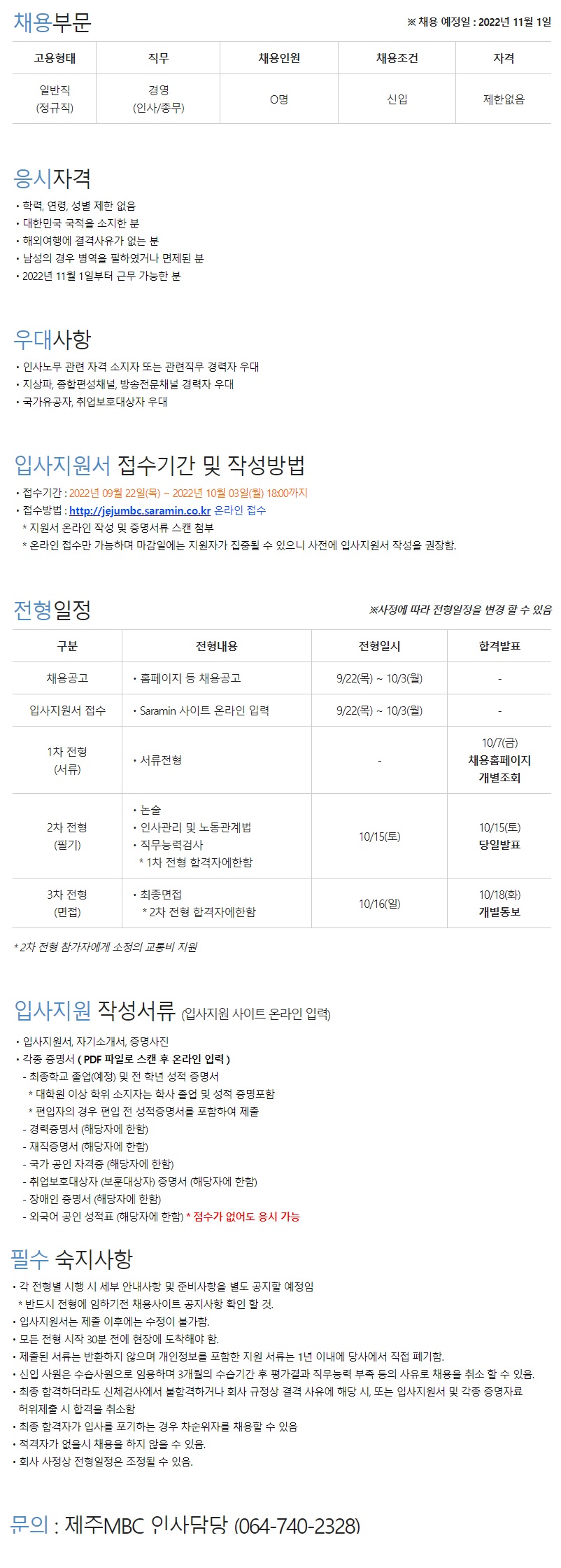 2022 제주MBC 신입사원 공개채용 [경영(인사/총무)]