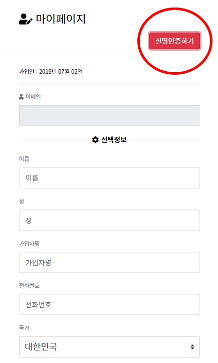 마이페이지 상단 오른쪽에 실명인증을 클릭하여 행정안전부 선거실명확인 페이지에서 본인인증을 하시고 이용하실수있습니다.