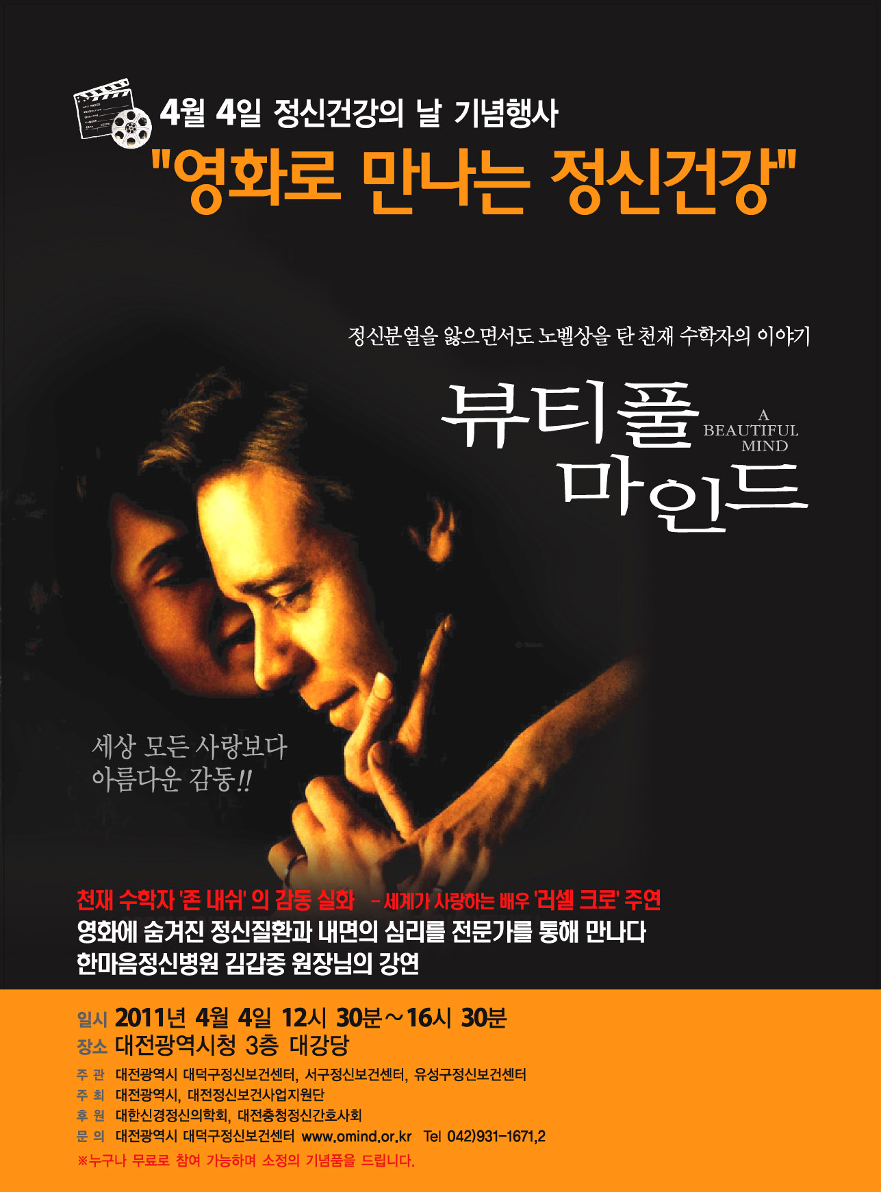 안녕하세요~ 혹시 4월 4일이 무슨 날인지 아세요? 많은 사람들이 숫자 4를 부정적인 숫자로 생각하는데 이 숫자가 두번이나 겹치는 날이니만큼 이날을 기분 나쁜 날로 생각할 수도 있어요~ 이런 생각의 전환을 주고자 이날을 '정신건강의 날'로 정했답니다. 마음과 정신을 건강하게 하자는 의미에서 생긴 날이니, 이날 만큼은 속상하거나 화나는 일이 없어야겠죠? 가능하시다면 시청에서 있을 '정신건강의 날' 행사에 오셔서~ 다도체험, 룰렛게임, 포토존촬영 등의 행사도 즐기시고~ '뷰티풀 마인드' 영화제에도 참석해 보세요!! 대전 시민분들이 함께 마음을 나누는 시간을 가지셨으면 좋겠네요.