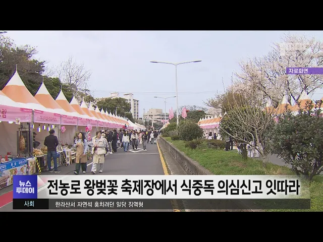 지난달 열린 전농로 왕벚꽃 축제장에서 음식을 먹은 뒤 식중독 의심증세가 나타났다는 민원 잇따르고 있습니다. 제주시에 따르면 제주보건소와 위생부서에 식중독 의심 신고는 5건에 7명으로 파악됐습니다. 이들은 행사장에서 판매한 김밥 등을 먹고 복통과 구토 등의 증세를 보인 것으로 알려졌습니다. 그러나 축제가 ...