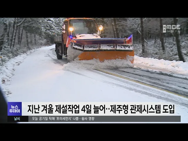 지난겨울 한파로 제설작업 일수가 늘어난 것으로 나타났습니다. 제주도에 따르면 지난 겨울 제설작업 일수는 53일로 작년에 비해 4일 늘어났고 모두 천700여 명의 인력과 770여 대의 장비가 투입된 것으로 집계됐습니다. 한편, 올 겨울부터는 이상 기후와 폭설 등에 대비해 인공지능 기반의 단말기를 제설차량에 설치해 ...