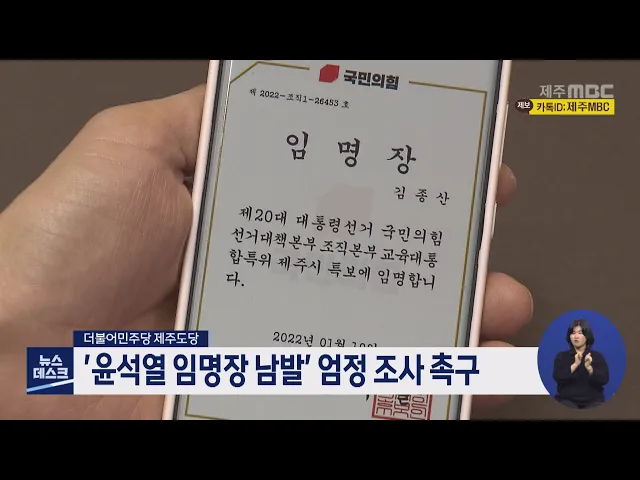더불어민주당 제주도당은 논평을 내고 국민의 힘 윤석열 후보는 당사자 동의 없는 임명장 발송에 대해 사과하라고 요구했습니다. 더불어민주당 제주도당은 제주MBC가 보도한 윤석열 후보 특별보좌관 임명장 남발과 관련해 본의동의 없이 무작위 임명장 남발은 비상식적 불법행위라고 비판하고 경찰과 선거관리위원회의 엄...