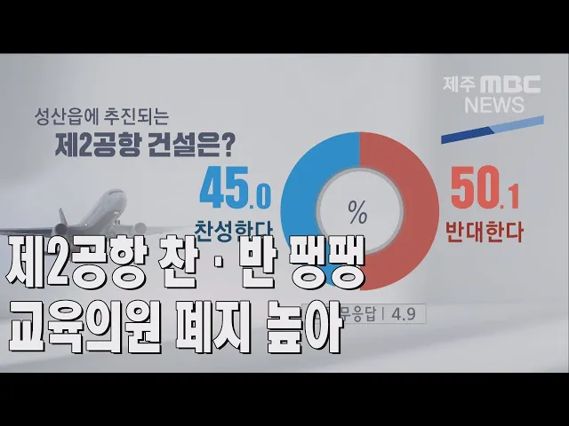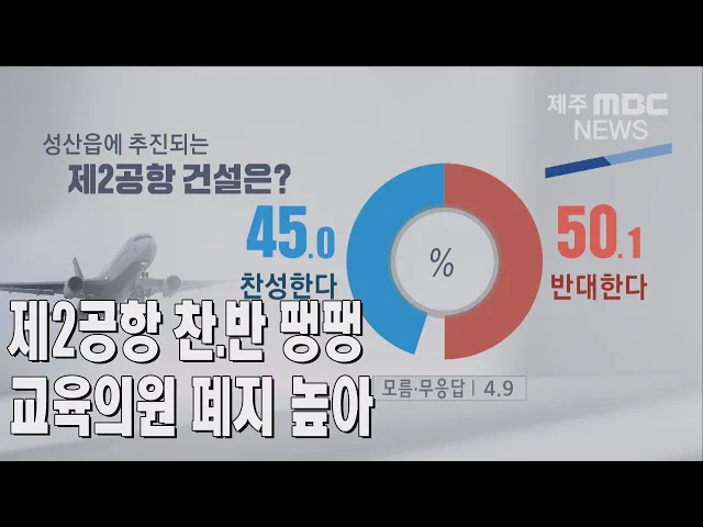 ◀ANC▶ 마지막으로 제주지역 현안에 대한 도민 여론조사 결과입니다. 제주 제2공항 건설에 대해서는 찬성과 반대 의견이 팽팽히 맞섰고, 교육의원은 폐지해야한다는 여론이 높았습니다. 권혁태 기자가 보도합니다. ◀END▶ ◀VCR▶ 환경부가 전략환경영향평가서를 반려하면서 제동이 걸린 제주 제2공항 건설 사업. 국토...