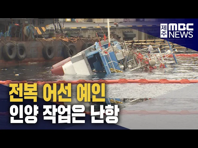 ◀ 앵 커 ▶ 지난 12일 서귀포 남쪽 바다에서 전복된 재성호가 서귀포항으로 예인됐습니다. 사고 원인을 조사하기 위해 복원과 인양작업이 시도됐지만 침수 상태가 심해 난항을 겪고 있습니다. 권혁태 기자가 보도합니다. ◀ END ▶ ◀ 리포트 ▶ 잔뜩 흐린 하늘아래 바닥을 드러낸 재성호가 항구에 자리를 잡았습니다. 커다...