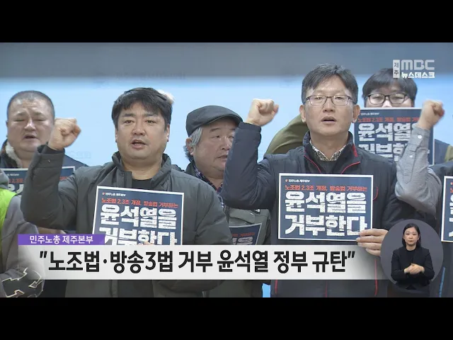 민주노총 제주본부는 오늘, 도의회 도민카페에서 기자회견을 갖고개정 노동법과 방송 3법에 대해 거부권을행사한 것에 대해 규탄한다고 밝혔습니다. 기자회견에서 민주노총 제주본부는이번 거부권 행사는 윤석열 정부가재벌대기업의 이익만을 대변하면서공영방송 장악에 대한 독재적 의지의 표현이라고 비판했습니다. 이와...