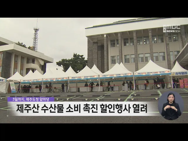 지역 수산물 소비를 활성화하기 위한수산물 소비 촉진 할인행사가 오늘부터 사흘간 제주도청 앞마당에서열립니다. 이번 행사에는 제주지역에서 생산된 수산물을시중가격 대비 30% 할인해 판매합니다. 제주도는 연말까지 수산물 수급가격 안정기금 15억 우너을 들여 제주 수산물 판매와홍보 지원 사업을 추진합니다.