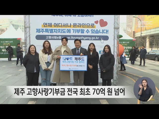 제주지역 고향사랑기부금이 전국 지자체 가운데 가장 많은 것으로 집계됐습니다. 제주도는 어제(24일) 경기도 의왕시에서 6만 5천622번째 기부로 제주가 전국 243개 지방자치단체 가운데 최초로 고향사랑기부금 누적 금액에서 70억 원을 돌파했다고 밝혔습니다. 고향사랑기부금 제도는 지난 2023년 시작됐는데 올들어 제...