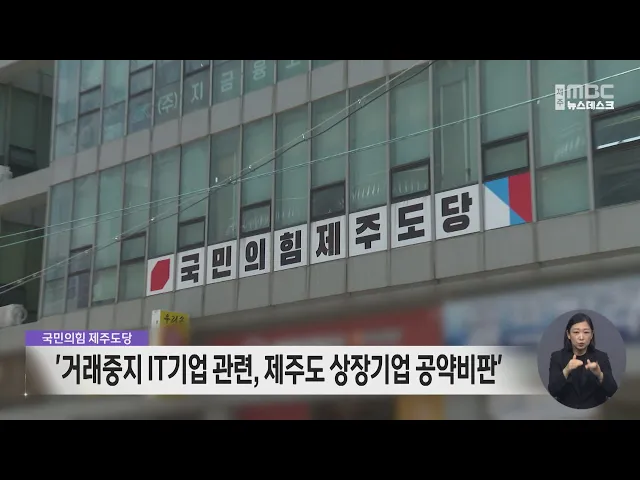 국민의힘 제주도당은 오늘 도내 한 IT기업 코넥스 시장 거래 중지와 관련해 논평을 내고, 오영훈 도정의 상장기업 육성 공약을 비판했습니다. 논평에서 국민의힘 제주도당은 오영훈 지사가 건실한 상장기업으로 직접 소개했지만 주식거래 정지를 당했다며 통상 주가조작이나 부실기업일 가능성이 농후하다며 제주도가 재무...