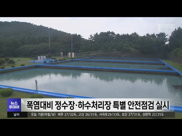 폭염이 이어지면서 제주도가 정수장과 하수처리장에 대한 특별 안전점검을 실시합니다. 다음달 말까지 이어지는 이번 점검에서는 밀폐공간에서 작업할 경우 안전 조치가 잘 이행되고 있는지와 붕괴 우려 지역에 대한 점검 등 모두 5개 분야 32개 항목을 중점적으로 살펴봅니다. 점검대상 도내 정수장 17곳과 하수처리장 5곳...