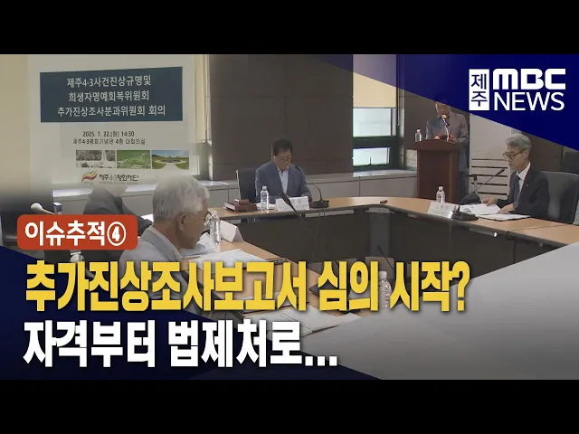 ◀ 앵 커 ▶ 4.3 추가진상조사보고서 문제를 다루기 위한 분과위원회가 열렸지만 결국 법제처에 심의 위원 자격을 물어보기로 하면서 안건은 심의되지도 못했습니다. 4.3해결의 새로운 기틀을 마련할 것으로 기대를 모았던 추가진상조사보고서는 또다시 위기를 맞고 있습니다. 이슈 추적, 권혁태 기자입니다. ◀ 리포트 ▶ 1년 ...