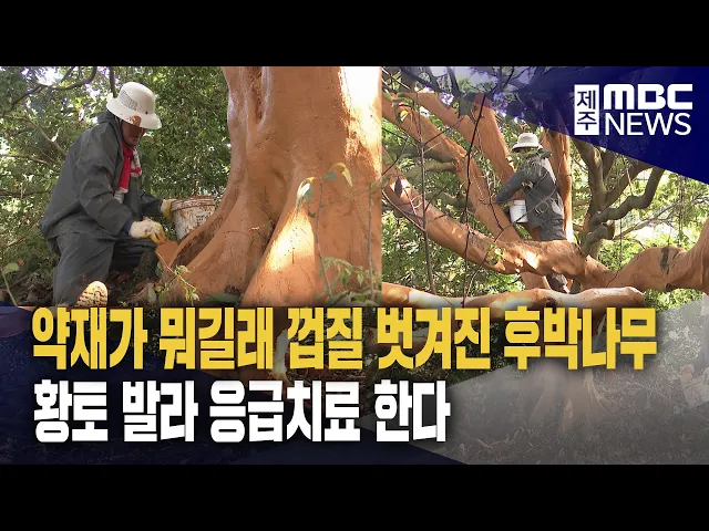 ◀ 앵 커 ▶ 얼마 전 제주도 난대림에서 자라는 세계적 희귀종인 후박나무 백여 그루에서 누군가 껍질을 통째로 벗겨가는 일이 있었는데요. 말라죽을 위기에 처한 후박나무를 살려내기 위해 황토를 바르는 응급치료가 시작됐습니다. 조인호 기자입니다. ◀ 리포트 ▶ 한라산 남쪽 들판에 흩어져 있는 제주의 난대림. 작업복을 ...