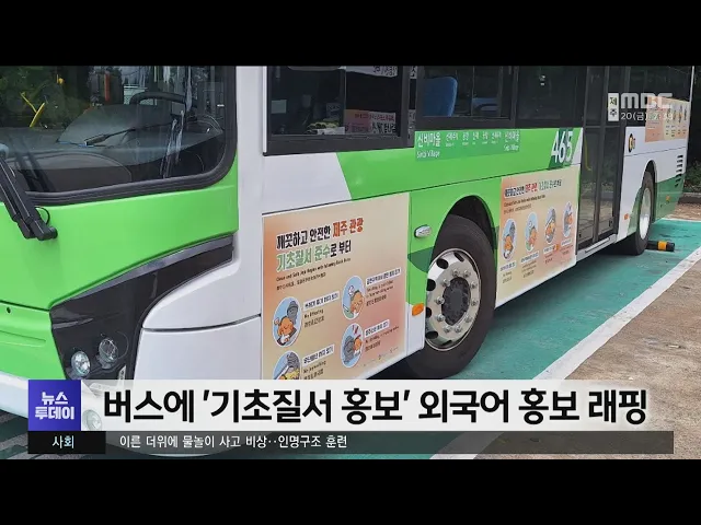 외국인들의 기초질서 확립을 위해 버스를 활용한 래핑홍보가 시작됐습니다. 제주경찰청은 시내버스 8대와 전세버스 15대 등 23대에 무단횡단과 쓰레기 투기, 금연구역과 음주소란 등에 대한 영어와 중국어 안내문구를 붙이는 래핑 홍보를 시작했습니다. 경찰은 외국인 기초질서 확립과 범죄 예방을 위해 가이드 등 관광종사...