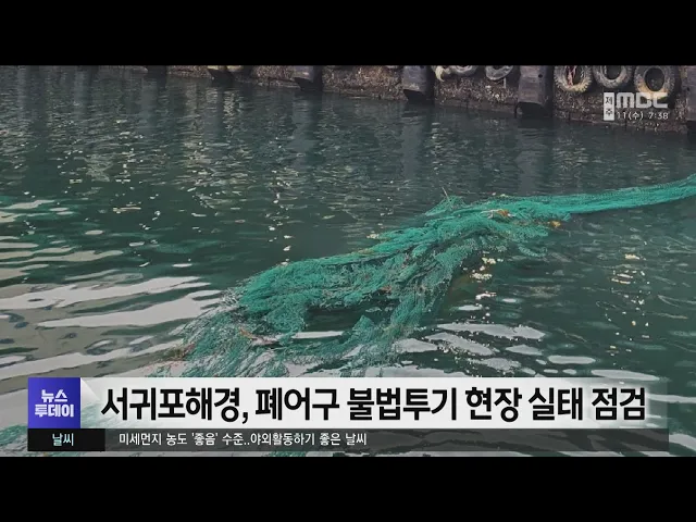 서귀포해양경찰서가 폐어구 불법투기를 예방하기 위해 관계기관들과 함께 현장 실태를 점검합니다. 해경은 지난달 우도 천진항 인근 해상에서 길이 200미터, 폭 20미터에 이르는 저인망 폐그물이 떠다니는 것을 발견해 수거했습니다. 이번 점검에서는 어선의 폐기물 기록부와 보증금제 준수 여부를 점검하고 내년부터 시행...