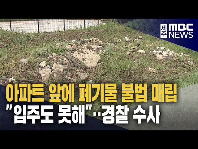 ◀ 앵 커 ▶ 제주영어교육도시의 아파트 단지 앞에 건축 폐기물 수십톤이 불법 매립된 것으로 드러났습니다. 불법 폐기물 때문에 아파트 입주도 늦어지고 있는데 자치경찰이 수사에 나섰습니다. 조인호 기자입니다. ◀ 리포트 ▶ 최근 제주영어교육도시에 들어선 신축 아파트 단지입니다. 아파트 단지 앞의 빈 터에 흰 돌무더...