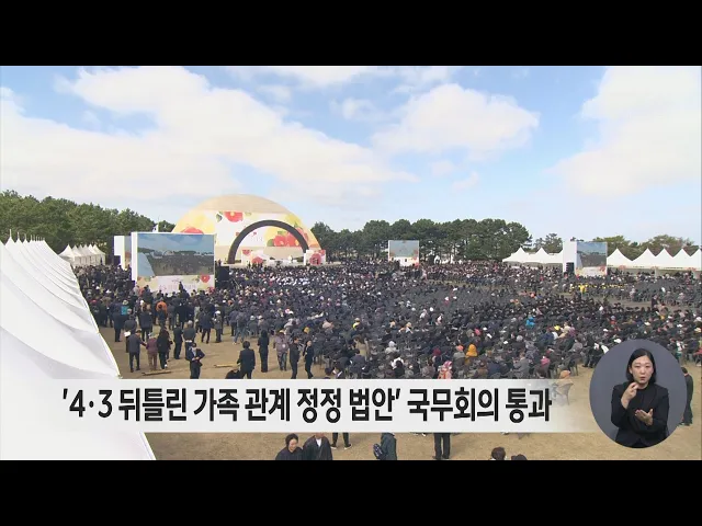 제주 4·3사건으로 뒤틀린 가족관계를 바로잡는 4.3특별법 개정안이 국무회의를 통과했습니다. 개정안은 4.3으로 사망하거나 행방불명된 희생자와 사실상 혼인관계에 있었던 사람은 위원회의 결정을 받아 혼인신고를 할 수 있고,희생자의 양자로 입양 신고를 하지 못한 사람도 위원회의 결정을 통해 신고를 할 수 있도록 했...