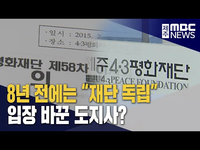 ◀ 앵 커 ▶ 제주 4.3 평화재단 이사장 임명권을둘러싼 논란이 좀처럼 가라앉지 않고 있는데요. 오영훈 제주도지사는 4.3평화재단도 제주도의 출자출연기관으로서 지도 감독을 받아야 한다며도지사가 임명해야 한다는 입장을 굽히지 않고 있습니다. 그런데, 8년 전 회의록을 확인해보니 당시 4.3 평화재단 이사였던 오영훈 지...