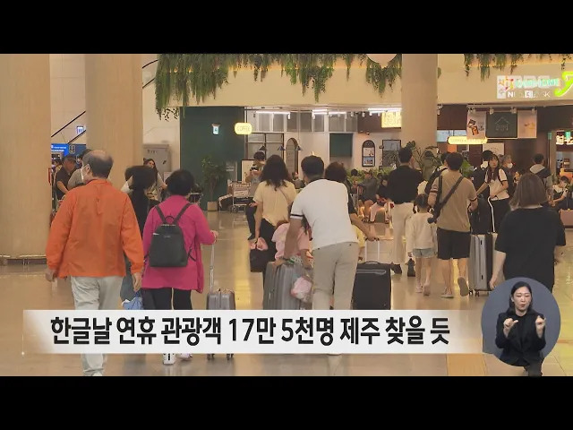 한글날 연휴기간에관광객 17만 5천명이 제주를 찾을 것으로 보입니다. 제주도관광협회는오늘(6일)부터 나흘 동안제주를 찾는 관광객이 17만 5천명으로지난해 같은 기간보다 1% 줄어들 것으로 전망했습니다.연휴기간 국내선 항공편으로 들어오는 관광객은 지난해보다 15% 줄어들 것으로 보이지만 국제선 항공편은 15배 늘어...