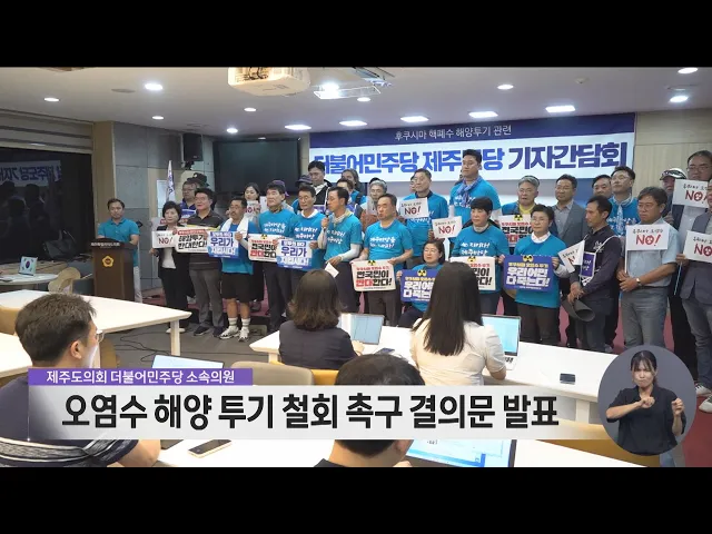 더불어민주당 제주도의원들이 후쿠시마 원전 오염수 해양 투기 결정 철회를 촉구하는 결의문을 발표했습니다. 이들은 일본의 오염수 해양투기 결정은 인류와 바다 생명에 대한 중대한 위협이자 천인공노할 범죄인데도 윤석열 정부와 국민의힘은 일본의 입맛대로 오염수의 안전성을 홍보하며 국민의 불안과 우려를 가짜뉴스...
