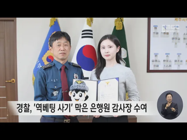 제주서부경찰서는 고액의 자금 이체를 유도하는 역베팅 사기를 막은 은행원 김시현씨에게 감사장을 수여했습니다. 김씨는 최근 은행 창구에서 고객으로부터 5천만원을 이체해달라는 요청을 받은 뒤 해외 축구 결과를 맞추지 못하면 돈을 준다고 속이는 역베팅 사기인 것을 알려줘 고객이 돈을 이체하지 않도록 도왔습니다...