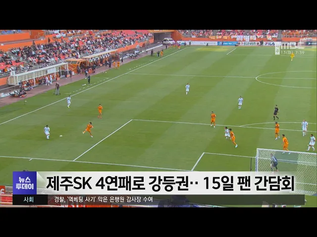 제주SK가 4연패에 빠지면서 강등권으로 추락한 가운데 팬 간담회를 엽니다. 제주는 어제 울산 HD에게 2대1로 졌고 지난달 26일부터 4연패를 기록해 3승 2무 8패로 케이리그원 11위로 추락했습니다. 제주는 기대에 미치는 못하는 경기력을 보인 점에 대해 팬들에게 사과하고 질책을 겸허히 받아들이겠다며 오는 15일 저녁...