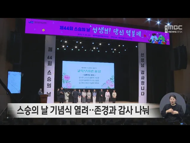 제44회 스승의 날 기념식이 제주학생문화원에서 열렸습니다. 제주도교육청이 주최한 기념식에서는 이경아 해안초등학교 교감 등 교사 131명이 스승의 날 유공 포상과 표창을 받았고 스승의 날 기념 손 편지 공모전 수상자 시상식도 열렸습니다. '선생님! 당신 덕분에'를 주제로 문화공연과 기념행사들도 열려 스승에 대...