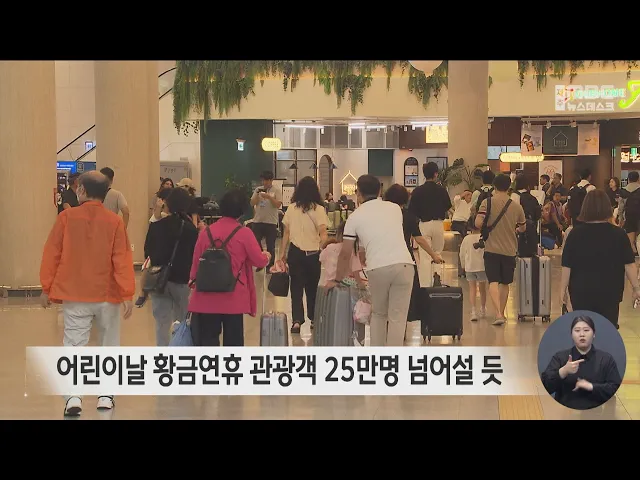 올해 어린이날 황금연휴에 제주를 찾은 관광객이 25만명을 넘어설 것으로 보입니다. 제주도관광협회에 따르면 지난 1일부터 어제까지 22만 천 400여명이 제주를 찾았고 오늘도 3만 5천여명이 들어올 것으로 보여 25만 6천여명에 이를 것으로 보입니다. 이는 지난해 어린이날 연휴의 25만 4천 300여명과 비슷한 수준입니...