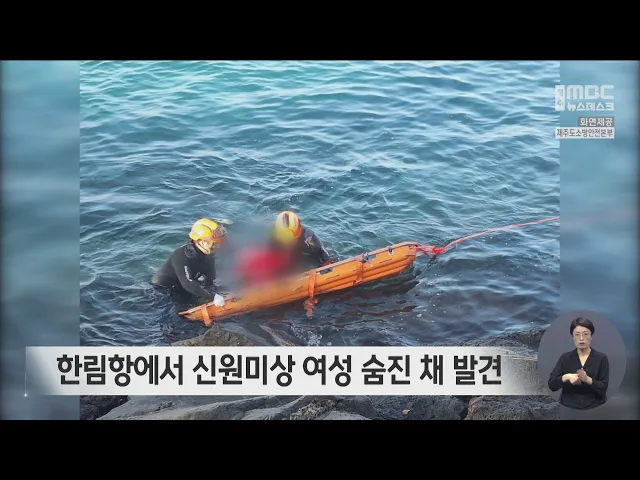 한림항에서 여성 시신이 발견돼 해경이 조사에 나섰습니다. 오늘 아침 6시 반쯤 제주시 한림항에서 물 위에 사람으로 보이는 물체가 떠있다는 신고가 119에 들어왔습니다. 119구조대는 70대로 추정되는 여성을 물 속에서 건졌지만 이미 숨진 것으로 확인됐고, 해경은 숨진 여성의 정확한 신원과 사망 원인을 조사하고 있습...