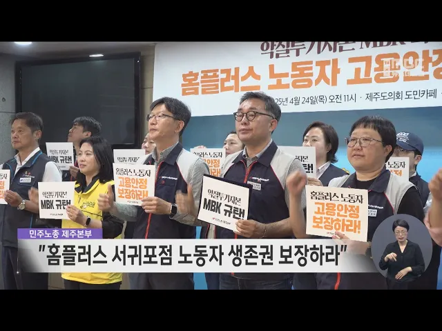 민주노총 제주본부는 제주도의회에서 기자회견을 갖고 악질투기자본 엠비케이 파트너스를 규탄하고 홈플러스 노동자의 고용안정을 촉구한다고 밝혔습니다. 이들은 사모펀드 엠비케이의 기업회생 신청으로 홈플러스 서귀포점의 노동자 200여 명도 구조조정의 위협을 받고 있다며 엠비케이와 투자자인 국민연금은 투자금 회수...