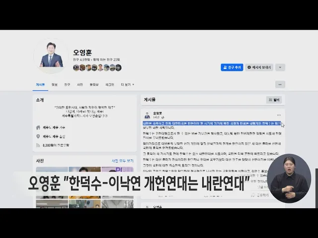 오영훈 제주도지사가 한덕수 전 국무총리와 이낙연 전 국무총리의 개헌연대를 내란연대라며 비판하고 나섰습니다. 오영훈 지사는 페이스북을 통해 한덕수 전 총리는 국정과 민생을 내팽개친 명실상부한 내란세력이라며 내란세력과 연대를 꿈꾸는 이낙연 전 총리의 셈법을 도대체 이해할 수 없다고 밝혔습니다. 오 지사는...