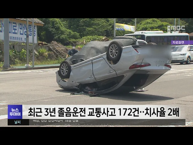 최근 3년 동안 제주지역에서 졸음운전 교통사고 172건이 발생해 3명이 숨지고 297명이 다친 것으 집계됐습니다. 졸음운전 교통사고의 치사율은 100건당 2.7명으로 전체 교통사고 치사율인 1.4명의 두 배였습니다. 도로교통공단 제주지부는 봄철에 춘곤증으로 졸음운전 사고가 발생하면 반응시간이 늦고 판단력이 낮아져 대...