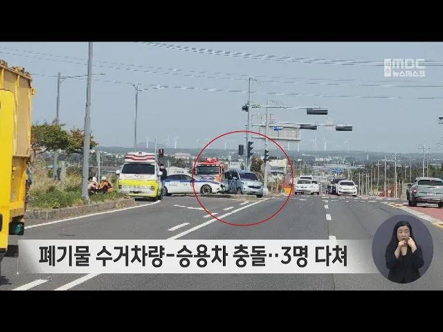 오늘 오후 2시 반쯤 제주시 조천읍 사리탑교차로 근처 우회도로에서 대형 폐기물 수거차량과 승용차가 충돌했습니다. 이 사고로 폐기물 수거차량에 타고 있던 30대 남성 2명과 승용차 운전자인 40대 남성 1명 등 3명이 다쳐 제주시내 병원으로 옮겨졌습니다. 경찰은 운전자 등을 상대로 정확한 사고경위를 조사하고 있습니...