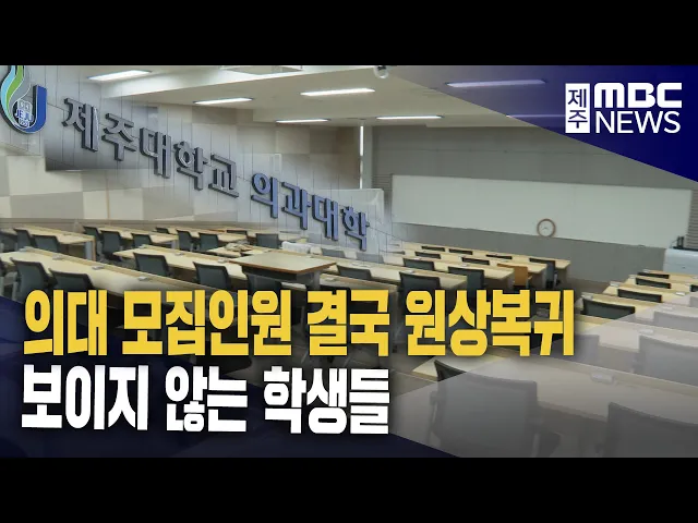 ◀ 앵 커 ▶ 정부가 내년 전국 의대 모집인원을 정원 2천 명 증원 이전으로 원상복귀하기로 결정하면서 제주대 의대 모집 인원도 다시 줄어들게 됐습니다. 학생들은 아직도 복귀하지 않아 수업은 여전히 파행을 빚고 있고 내년 이후에는 어떻게 해야 할지 첩첩산중입니다. 조인호 기자입니다. ◀ 리포트...