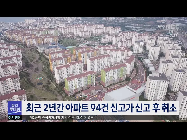 제주지역에서도 높은 가격에 아파트를 거래했다고 신고한 뒤 취소하는 사례가 적지 않은 것으로 나타났습니다. 국민의힘 김선교 의원이 국토교통부로부터 받은 자료에 따르면 2021년부터 지난해까지 제주지역 주택거래 계약해제 383건 가운데 신고가로 신고한 뒤 해제한 사례는 24.5%인 94건이었습니다. 이는 전국에서 세...