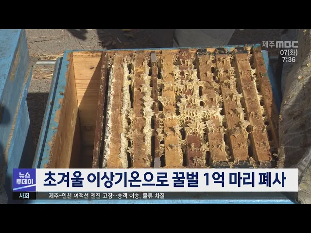 올 겨울 이상기온으로 꿀벌 폐사 피해가 잇따른 것으로 나타났습니다. 제주도에 따르면 지난해 12월부터 접수된 꿀벌 피해는 양봉농가 101군데에 7천여군으로 최소 1억 마리 이상이 폐사한 것으로 추산되고 있습니다. 이는 11월에 따뜻한 날씨가 이어지자 외부에서 활동을 하던 꿀벌이 벌통으로 돌아오지 않았기 때문인데 ...