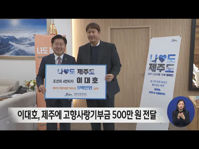 지난해 프로야구에서 은퇴한 이대호 전 롯데 자이언츠 선수가 NH 농협은행 연북로지점을 찾아 고향사랑 기부금 연간 최고 금액인 500만원을 제주에 기부했습니다. 이대호 선수는 제주 출신 프로야구 선수인 강민호를 통해 제주도와 인연을 맺게 됐다고 밝혔는데, 제주에서 받은 기부 답례품은 고향인 부산의 복지시설에 전...