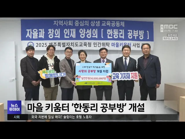 지역사회가 함께 운영하는 마을키움터인 한동리 공부방이 문을 열었습니다. 제주시 구좌읍의 한동리 공부방에서는 초등학생과 중학생 34명을 돌봐주면서 영어와 수학 공부도 도와주는데 농협은행 제주본부가 노트북과 전자칠판 등 교육기자재 천만 원어치를 기탁했습니다. 마을키움터는 2018년부터 시작됐고, 제주도교육청...