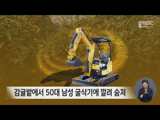감귤밭에서 50대 남성이 소형 굴삭기에 깔려 숨졌습니다. 오늘(20일) 오후 2시 반쯤 서귀포시 신효동의 감귤밭에서 50대 남성이 소형 굴삭기에 깔려 병원으로 옮겨졌지만 숨졌습니다. 경찰은 감귤밭에서 작업을 하다 사고가 난 것으로 보고 주변 사람들을 상대로 정확한 사고 원인을 조사하고 있습니다.