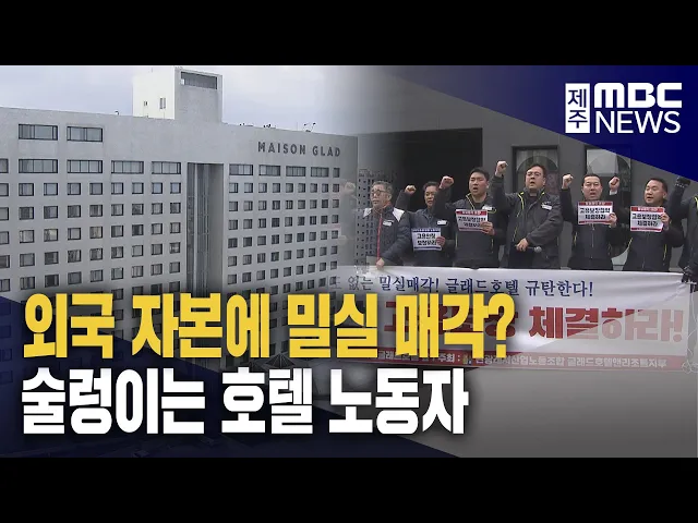◀ 앵 커 ▶ 제주 관광업계를 대표하는 랜드마크였던 메종글래드호텔이 외국 자본에 매각 절차를 밟고 있는데요 호텔 노동자들이 고용보장을 장담할 수 없는 밀실 매각이라며 반발하고 나섰습니다. 조인호 기자입니다. ◀ 리포트 ▶ 제주에서는 세 번째로 많은 객실 500여 개를 갖고 있는 메종글래드호텔입니다. 신제주 개발 당...