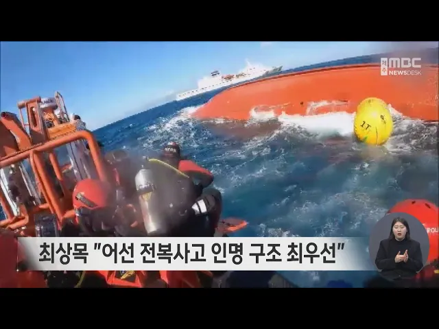 최상목 대통령 권한대행은 제주 해상 어선 전복 사고와 관련해 최우선적으로 인명을 구조하라고 지시했습니다. 최상목 권한대행은 행정안전부와 해양경찰청은 경비함정과 수중수색 구조대원 등을 총동원하고 해양수산부와 국방부, 제주도지사는 인력과 장비를 적극 지원하며 구조대원의 안전에도 만전을 기하라고 당부했...